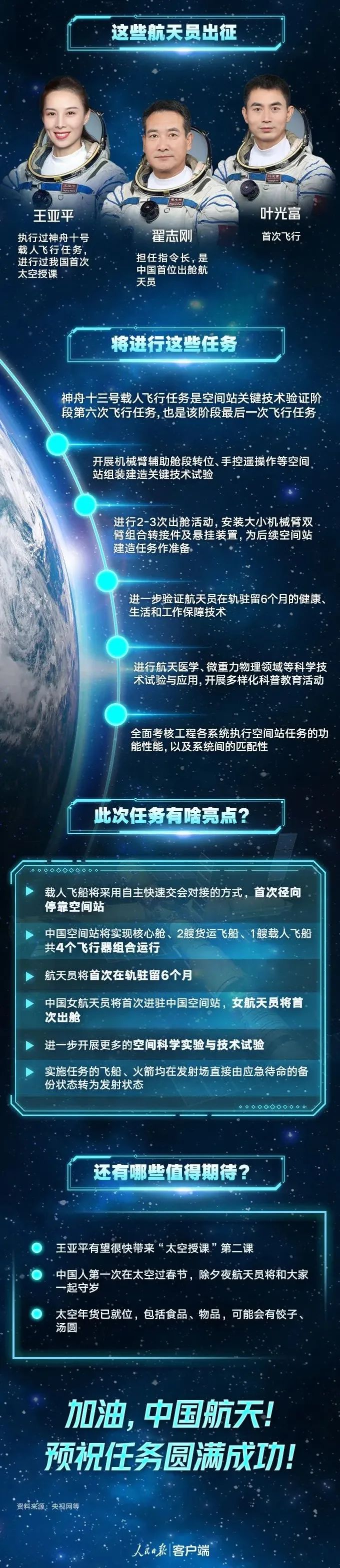 未来6个月太空生活怎么过? 官方披露的信息显示,“神十三”任务期间,航天员们将在轨完成多项任务。比如,开展机械臂辅助舱段转位、手控遥操作等空间站组装建造关键技术试验;进行2-3次出舱活动,安装大小机械臂双臂组合转接件及悬挂装置;进一步验证航天员在轨驻留6个月的健康、生活和工作保障技术;进行航天医学、微重力物理领域等科学技术试验与应用,开展多样化科普教育活动等。 此次出征的主要任务 一起来看看 ↓↓ ![]() 致敬中国航天 致敬中国航天人! 【编辑:张洁】 免责声明:如有侵权,请联系删稿。  |