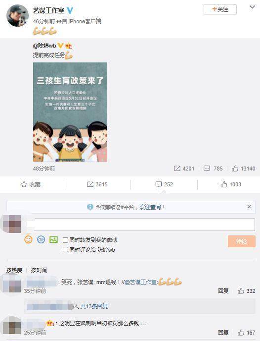 三胎政策来了, 张艺谋妻子发博: 提前完成任务!时间:2021-06-01 5月31日张艺谋的妻子陈婷转发了“三孩生育政策来了”的宣传海报,并在配文中写道:提前完成任务。随后,这条内容被张艺谋工作室转发,并配上了同样的“加油”表情。