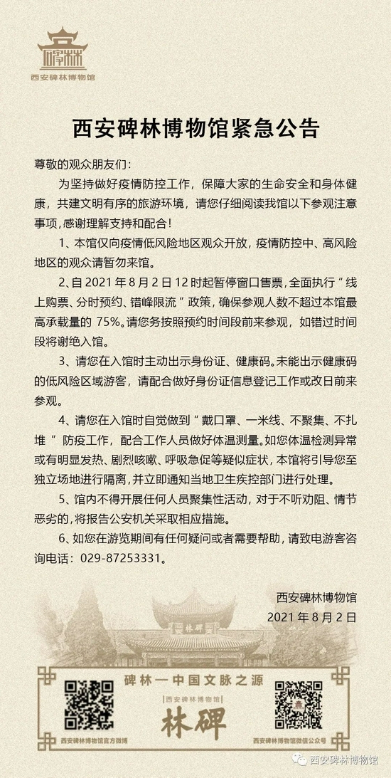 ![]() 西安城墙景区暂停 《迎宾开城仪式》演出 ▼ 西安城墙景区发布公告,从2021年8月1日起,西安城墙景区暂停《迎宾开城仪式》演出,恢复时间另行通知。 景区同时呼吁广大市民游客在公共场所、公交地铁等人员密集区域戴好口罩,配合扫码测温,保持安全间隔距离,合理规划出行时间。 如有疑问,可致电景区服务咨询电话:029-87272792。 西安:扩大筛查范围,确保不漏一人! 8月1日,西安市召开疫情防控工作调度会议,听取全市疫情防控工作推进情况,分析研判当前形势,研究部署全市疫情防控工作。 会议指出,当前疫情防控形势严峻,疫情风险就在身边。要始终绷紧思想之弦,落实“四方”责任、“四早”要求,坚决做到“三个一切”“五个所有”,全面落实常态化疫情防控各项措施,处置更迅速、措施更严格、封控更果断,努力做到严防死守、精准防控,做到心中有数,牢牢把握疫情防控工作主动权,确保十四运会顺利圆满、人民群众生命健康安全。 会议强调,要从严从快抓好疫情处置,迅速开展流调溯源,全面梳理确诊病例行程轨迹,形成闭环管控,扩大筛查范围,做到全覆盖、无缝隙,落实核查管控、隔离观察、核酸检测等措施,确保不漏一人。 要持续抓好外防输入、内防反弹工作,全面抓好“一场五站”等重点场所疫情防控工作,强化人物同防,严格落实机场口岸防控措施,加大核酸检测、清洁消杀力度和频次,境内外航班场地实施硬隔离,国际国内分区运行,所有入境人员和参与国际航班保障工作人员全部实行闭环式管理; 铁路、民航和公路严格排查管控,落实出示健康码、大数据行程卡、48小时核酸检测阴性证明等措施; 医院、隔离酒店等重点场所要查漏补缺、优化流程,做好筛查、转运、隔离、救治各项工作,强化闭环管理,确保不出任何问题。 会议强调,各类医疗机构、诊所、药店要严格落实首诊负责制,认真筛查风险人员,及时预警,严防漏管失管。 企业、商超等人员密集室内公共场所和公共交通场站要严格落实戴口罩、扫码、测温、一米线、不聚集等常态化防控措施; 旅游景区、演出场所、文博场馆等要严格落实“限量、实名预约、错峰”要求,接待游客量不得超过最大承载量的75%。 要提高密度、扩大范围做好重点人群、重点行业核酸检测,增加对“一场五站”工作人员和商超等密闭场所从业人员、医院门诊医务人员、隔离场所管理服务人员、铁路服务人员、出租车网约车司机、冷链物流从业人员等核酸检测频次,做到全面覆盖、应检尽检。 会议要求,各区县、开发区要警觉起来,立即迅速行动,及时、公开、透明、准确发布疫情信息,加强宣传引导,回应社会关切,提升全民防控意识,提醒市民非必要不前往中高风险地区,坚持戴口罩、勤洗手、保持社交距离等常态化防控措施不能放松,积极配合疫情防控工作。要加快推进疫苗接种工作,实现应接尽接,尽快形成免疫屏障。 西咸新区全面从严加强当前新冠肺炎疫情防控工作 近期,国际疫情持续蔓延,国内相继发生本土聚集性疫情,中高风险地区快速增加。针对当前日趋严峻复杂的疫情形势,为进一步从严加强疫情常态化防控措施,有效阻止疫情在西咸新区发生,保障广大市民健康安全,现就全面从严加强当前新冠肺炎疫情防控工作通告如下: 加强入境人员管控。对西安口岸入境目的地为我辖区的入境人员,实施21天集中隔离+7天居家隔离、核酸检测及“点对点”闭环转运措施。对外省口岸隔离期满来返新区人员,落实交通站点“点对点”闭环接回,补足“21天集中隔离+7天居家隔离”的管控措施,并开展核酸检测。 加强风险地区返回人员管控。广大市民要密切关注中高风险地区信息动态,合理安排行程,非必要不出市,不前往中高风险地区;对近期有外地来访计划的亲友请及时配合劝返。如14天内有中高风险地区旅居史、或与确诊病例以及无症状感染者有行程交叉的人员,请务必第一时间主动向所在社区和单位报备,主动配合做好信息登记及管控工作。 从严做好聚集性会议活动管控。各级各部门、企事业单位等原则上不再举办或承办各类线下会议、活动,确需举办的,落实举办方主体责任,压缩规模、控制人数(原则上不超过100人),严格执行逐级报备要求,落实好测温、戴口罩、健康码核验、通风消毒等防控措施。 加强社区摸排管控。全区所有社区、居民小区要加强重点人群摸排管控,全面开展入口处测体温、查验健康码(行程码)、检查口罩佩戴情况等防控措施,并经常性做好环境消毒工作,如发现中高风险地区来返新区人员,要第一时间上报,并配合做好重点人员“点对点”转运和隔离管控;坚决杜绝隔离对象私自出行甚至离开隔离场所的现象发生。 加强重点场所防控工作。机场、阿房宫高铁站、十四运马术和小轮车赛事场地周边人员定期进行核酸检测。超市商场、宾馆酒店、农贸市场等人员密集公共场所必须严格落实扫码、测温、戴口罩、“一米线”等措施,对拒不配合的,可拒绝入内;旅游景点要落实75%限流等措施,引导群众错峰、预约、不聚集。发现红码、黄码人员,第一时间采取管控措施并上报新城、新区疫情防控指挥部,“点对点”转运至隔离场所。 从严做好重点人员物品核酸检测。各医疗机构对所有就诊人员均须开展核酸检测。零售药店销售“一退两抗”药品实名登记,并原则上要求出示购买人
