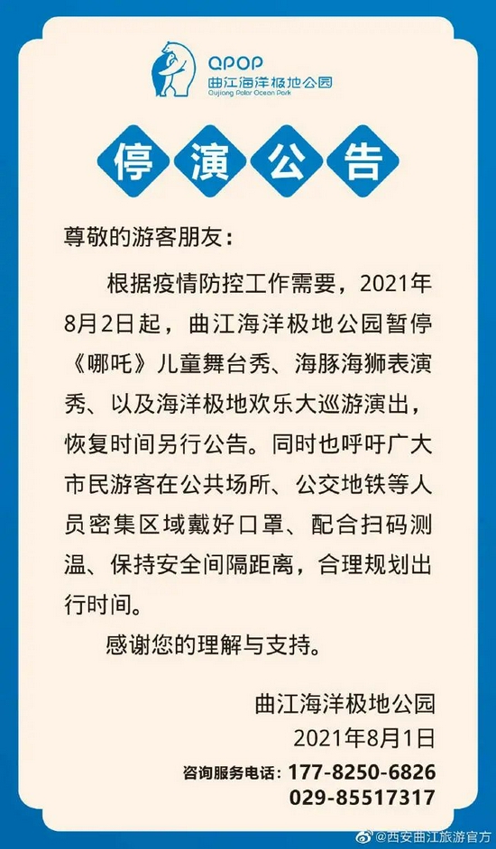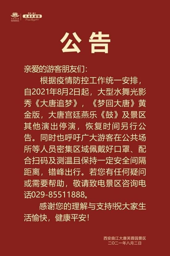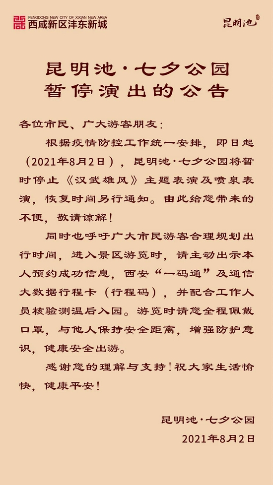 根据疫情防控需要, 8月1日至2日, 陕西多个景区发布公告, 暂停演出及人工售票窗口, 具体如下: 昆明池·七夕公园 暂停演出的公告 ▼