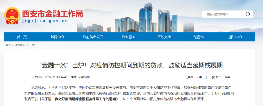西安发布“金融十条”!对疫情防控期间到期的贷款,鼓励适当延期或展期时间:2022-01-14