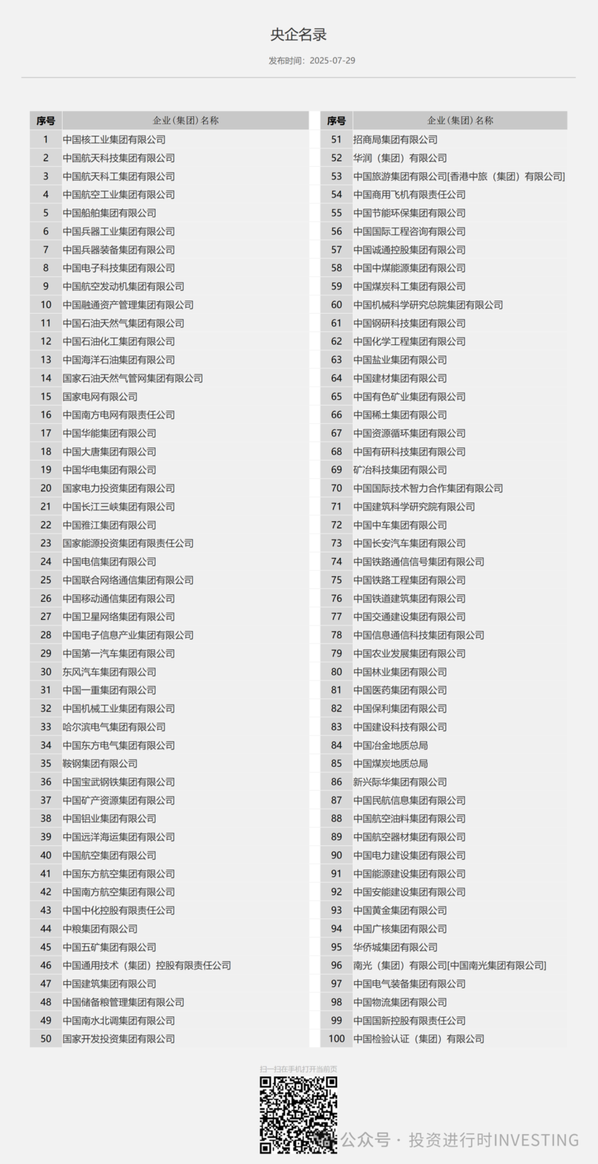 中国100家央企名录