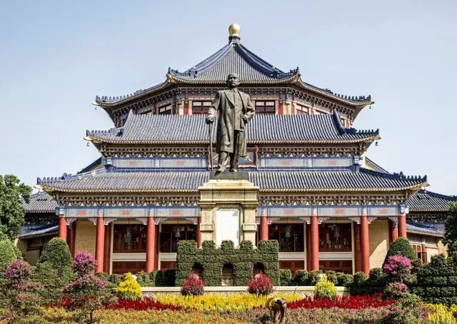 然后~ 根据正史记载,几乎每一任皇帝都不敢忘记"修缮镇海楼"这项工作! 明朝成化年间,朝廷命广军务提督韩雍重修镇海楼。 明朝嘉靖年间,朝廷命提督蔡经与侍郎张岳重修镇海楼。 明朝崇祯十年,朝廷命广东布政使姜一洪再次修缮镇海楼。 ▼ 清军入关后。 顺治八年,平南王尚可喜先后对镇海楼重修了三次。 顺治十八年,李栖凤任两广总督期间,又大修镇海楼。 ▼ 康熙二十四年,朝廷斥资万金重建镇海楼。(据说,是吴三桂叫尚可喜毁掉的) 当年,新建造的镇海楼,高计七丈五尺,广计九丈五尺,袤计五丈七尺。 ▼ 终于~终于~ 在清末八国联军之后,这条被压制了近五百年的广州"帝王龙",终于起到了历史性的意义! 虽然仅是临时大总统(帝王)~ 但,是他!给整个中国带来了希望的曙光~ ▼ 国父:孙中山 新中国成立后: 广州市人民政府于1954年拨专修款修缮了镇海楼,改名为广州博物馆。 1963年列为广州市文物保护单位,1989年晋升为广东省文物保护单位。 今年,晋升国家一级博物馆。 【千年中轴线】 前世今生 ▼ 广州城两千多年以来,不管是战乱还是天灾,都未曾让它"伤筋动骨"。 纠其风水原因,是因为"广州中轴线"一直都是坐山面水,四象齐全! 而且靠的"山",就是上述那个牛逼的越秀山"帝龙脉"。 且从明朝至今,城市的建筑规划一直都在"为龙修路"。